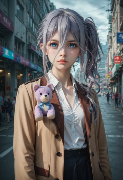 1girl,black hair,blue eyes,brown jacket,expressionless,eyes visible through hair,grey hair,jacket,long hair,looking at viewer,open clothes,outdoors,reine murasame,shirt,side ponytail,sidelocks,skirt,solo,stuffed animal,<lora:reine-murasame-s4s5-ponyxl-lora-nochekaiser:1>,, cinematic film still,score_9,score_8_up,score_7_up,dramatic lighting,(realistic:1.3),highly detailed,high budget,bokeh,cinemascope,moody,epic,gorgeous,film grain,grainy,masterpiece,best quality,perfect anatomy,very aesthetic,official art,8k,