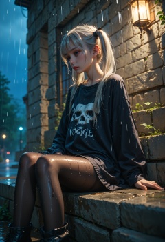 1girl,solo,petite,black pantyhose,loose clothes,goth,platinum blonde hair,twintails,Shiny skin,stone steps,night,rain,leaning back,dynamic lighting,modern,vogue,sitting,score_9,score_8_up,score_7_up,masterpiece,best quality,8k,, score_9,score_8_up,score_7_up,masterpiece,best quality,8k,