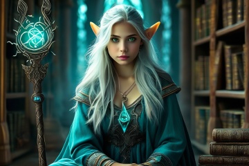 realistic photo, high detail, 4K resolution, sharp, detailed, 18-year-old elven mage girl, slender, raw, realistic, graceful sitting pose, front view, mystical library background, fair skin, ethereal glow, delicate features, shimmering green eyes, pointed ears, long flowing silver hair, intricate jewelry, ornate staff, flowing blue robe, arcane symbols, magical aura, ancient books and scrolls