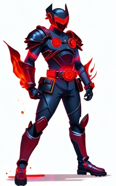 solo, red eyes, gloves, 1boy, white background, standing, full body, male focus, belt, armor, glowing, helmet, fire,game character style