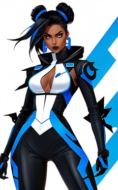 The image shows a woman in a black and white outfit with blue accents, standing against a white and blue background. She has a determined expression on her face, as if she is ready to take on any challenge that comes her way. Her outfit is a combination of black, white, and blue, giving her a unique and eye-catching look,game character style