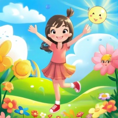 A charming cartoon scene featuring one girl, depicted in a lively, animated style. She stands center-frame, exuding joy with her arms outstretched and a big, beaming smile. The background is a vibrant, colorful landscape, with playful elements like cartoon flowers and cheerful clouds. The lighting is bright and sunny, adding to the whimsical atmosphere. The composition highlights her expressive face and the fun, exaggerated details of the cartoon environment, creating a delightful and engaging visual story.