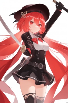 1girl, solo, breasts, looking at viewer, short hair, bangs, skirt, red eyes, gloves, hat, holding, bare shoulders, jewelry, weapon, white hair, pantyhose, cowboy shot, sleeveless, black gloves, belt, sword, black skirt, holding weapon, black headwear, thigh strap, beret, holding sword,可爱水彩插画头像_烟上月,torino,k7,Q,Melting