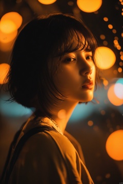 暗光摄影,一个亚洲女孩,短发,简单的背景,黑的背景透露着暖色调的光斑