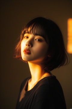 摄影,肖像,一个亚洲女孩,短发,简单的背景,黑的背景透露着暖色调的光斑