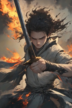 武侠, 该图片描绘的人物看起来像是来自动漫或漫画,因为其风格化的特征和戏剧性的姿势。该人物手持一把剑,剑柄和剑刃细节丰富,暗示着动作或战斗。飘逸的头发和衣服表明动作,可能是在战斗场景中。背景是抽象的,带有火焰元素,可能代表混乱或毁灭,这些元素通常伴随着此类媒体中的激烈场景。色调主要是冷色调,背景中的暖色除外,形成了鲜明的对比。