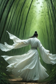 武侠, 该图像是一幅数字艺术作品,捕捉了中国传统服饰和自然的精髓。主体是一个身着白色长袍的人,长袍的袖子飘逸,象征着优雅和动感。长袍的设计让人联想到历史上的中国服饰,这种服饰经常出现在文化表演或古代中国的表现中。人物的姿势暗示着一种舞蹈或与自然的精神联系,仿佛他们是森林本身的一部分。背景是高大的竹树,在中国文化中,竹树通常与宁静和长寿联系在一起。绿叶茂密,郁郁葱葱,表明森林健康、繁茂。透过竹林的光线营造出一种宁静的氛围,增强了场景的神秘感。整体印象是人与周围环境的和谐,唤起一种平和的感觉和与自然的联系。