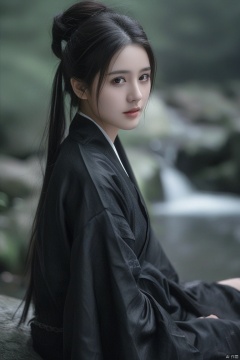 使用水墨画风格拍摄,森林女妖坐在一块岩石上,穿着黑色长袍,头发盘起,面容妖媚。镜头从侧面拍摄,背景是模糊的森林和流水,古典艺术风格,气氛魅惑,高分辨率,
