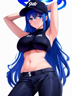 1girl, solo, long hair, breasts, looking at viewer, blue eyes, shirt, large breasts, hat, navel, standing, blue hair, sleeveless, pants, belt, midriff, stomach, armpits, halo, arm up, crop top, black shirt, black headwear, sleeveless shirt, mask, black pants, baseball cap, mouth mask, saori (blue archive)