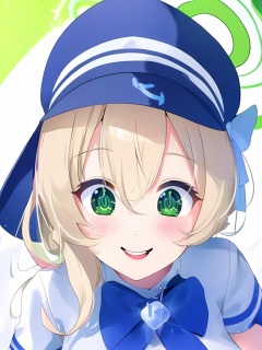1girl, solo, smile, hat, green eyes, halo, nonomi (blue archive), nonomi (swimsuit) (blue archive)