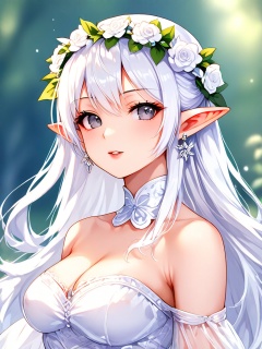 1girl, solo, long hair, breasts, looking at viewer, dress, jewelry, bare shoulders, medium breasts, upper body, white hair, flower, earrings, parted lips, detached sleeves, pointy ears, hair flower, white dress, blurry, grey eyes, elf, head wreath