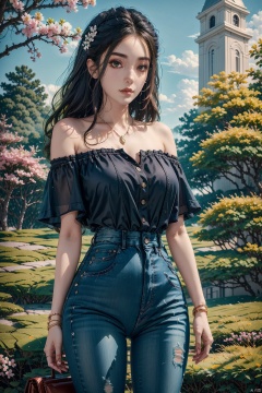 masterpiece, ultra-clear picture quality, real effect, 8k ultra-clear, fine picture effect, 1girl, solo, long hair, shirt, black hair, holding, jewelry, standing, white shirt, purple hair, flower, outdoors, day, pants, necklace, off shoulder, bag, bracelet, tree, lips, petals, denim, cherry blossoms, building, pink flower, jeans, handbag, ((poakl))