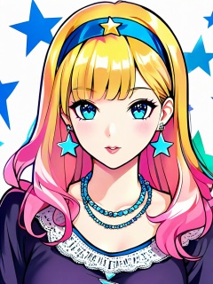 1girl, solo, long hair, looking at viewer, blonde hair, hair ornament, jewelry, pink hair, multicolored hair, earrings, hairband, parted lips, necklace, star (symbol), star earrings