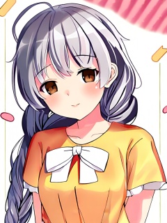 1girl, solo, long hair, looking at viewer, blush, shirt, bow, brown eyes, upper body, grey hair, ahoge, braid, short sleeves, parted lips, twin braids, white bow, hisakawa nagi