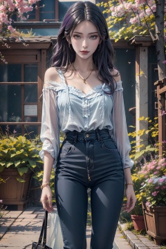 masterpiece, ultra-clear picture quality, real effect, 8k ultra-clear, fine picture effect, 1girl, solo, long hair, shirt, black hair, holding, jewelry, standing, white shirt, purple hair, flower, outdoors, day, pants, necklace, off shoulder, bag, bracelet, tree, lips, petals, denim, cherry blossoms, building, pink flower, jeans, handbag, ((poakl)),white hair