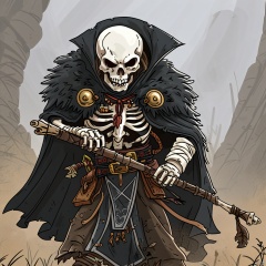一个骷髅族,白色的骨头,黑色的披风,拿着武器
