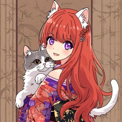 1girl,red hair,purple eyes,furisode,long hair,cat