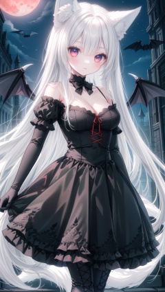 (masterpiece),best quality,highres,stunning art,beautifully painted,colorful,soft lighting,(rim light:1.2),fantasy,,outdoors,at night,red moon,(old castle),against window,standing,dancing,hypnosis,dark persona,mind_control,solo,1girl,,vampire,wings,(bat_wings),white fox tail,(white fox ears:1.2),(black rose:0.8),long hair,white hair,Oil brighten hair,(finely detailed eyes and detailed face:1.3),deep red eyes,expressionless,medium breasts,cleavage,long waist,gothic_lolita,frilled dress,(clothes red lace-up:1.4),(lace-up clothes from bust to skirt),black skirt,off shoulder,black elbow gloves,black thighhighs,feet,high heels
