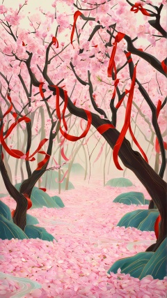 桃花林充满了国潮风格的独特韵味。桃花林中,粉色的花瓣铺满地面,仿佛一片柔软的花毯。树干上缠绕着红色的丝带,与桃花的色彩相互映衬