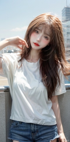 solo_female,head tilt,cityscape,white T-shirt,shorts,thin,nipples under the breasts:1.2,stretching,small_breasts