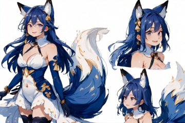 masterpiece, highly detailed, centered, Reference Material, conceptart,multiple views,white background,simple background, multiple views of the same character, (full body:1.5), BREAK PIXIV, blue fire, solo, 1girl, long blue hair, fox ears, erune, fox tail, nine tailed fox tail, big fluffy fox tail, fang, hair ribbon, purple ribbon, hair bell, golden jingle bell, white dress, short dress, backless outfit, elbow gloves, black gloves, thigh ribbon, blush, smile, open mouth, head tilt, granblue fantasy inspired, absurdres, Expressiveh, Ultra HD, 4k image, (from side, front), charactersheet,kidz,pastelmix