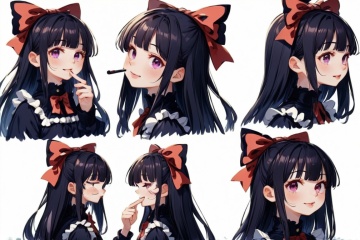 masterpiece, highly detailed, centered, Reference Material, conceptart,multiple views,white background,simple background, multiple views of the same character, (full body:1.5), BREAK PIXIV, 1girl, solo, long hair, smile, bangs, black hair, red eyes, bow, ribbon, purple eyes, hair ribbon, hair bow, blunt bangs, finger to mouth, fashion, hime cut, gothic girl, absurdres, Expressiveh, Ultra HD, 4k image, (from side, front),charactersheet,kidz,pastelmix