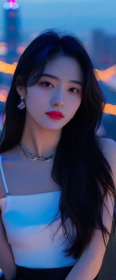 hyper realistic photo of a beautiful girl,20yo,detailed exquisite face,soft shiny skin,Korean K-pop girl,long and natural black hair styled impeccably reflecting modern urban trends,perfect female form,model body,elegant urban fashion,earrings and necklaces,Kristen Stewart lookalike, standing on a high-rise rooftop overlooking a vibrant city nightscape, with neon lights reflecting off the glass windows, smiling softly., [cobalt blue,yellow and cream colors],, dark:1.3,chiaroscuro lighting:1.2, ek_ph0t0_b00ster