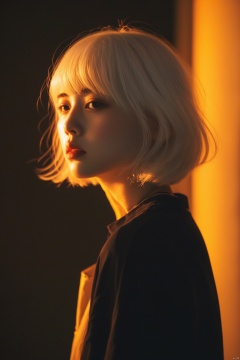 摄影,肖像,一个亚洲女孩,站立,全身,短发,白发,简单的背景,黑的背景透露着暖色调的光斑