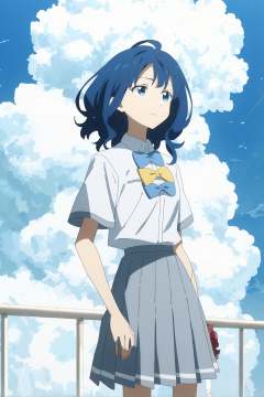 score_9, score_8_up, score_7_up, score_anime, 8k, best quality, masterpiece, <lora:Yanami_Anna-pony-Tanger:0.8>, Yanami Anna, 1girl, blue hair, blue eyes, default clothes, socks, white shirt, shoes, short sleeves, blue collared shirt, school uniform, bow, beautiful blue sky, cloud, standing, upper body,