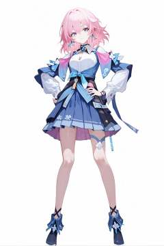 score_9, score_8_up, score_7_up, score_anime, 8k, best quality, masterpiece, (ultra-detailed), (white background,simple background:1.3), solo, hands on hip, (full body:1.1), looking at viewer, <lora:pony-Ldart_xl-000008:0.6>, masterpiece, best quality, <lora:Sh1r3nXLP:0.3>, (Sh1r3n:1.2), <lora:g0th1cPXL:0.3>, g0thicPXL, glowing, neon, <lora:March7-pony-Tanger:0.8>, sanyueqi, 1st clothes, 1girl, blue skirt, pink hair, white shirt, bangs, long sleeves, blue eyes,
