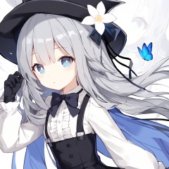 1girl, solo, long hair, looking at viewer, bangs, blue eyes, skirt, shirt, gloves, long sleeves, hat, hair between eyes, very long hair, closed mouth, upper body, flower, grey hair, black gloves, puffy sleeves, collared shirt, hand up, black skirt, book, black headwear, bug, white flower, butterfly, grey shirt, high-waist skirt, purple flower, hat flower