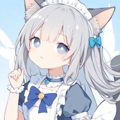 1girl, solo, looking at viewer, blush, bangs, blue eyes, long sleeves, dress, bow, animal ears, hair between eyes, jewelry, tail, white shirt, upper body, grey hair, frills, parted lips, fang, puffy sleeves, cat ears, hand up, white dress, :o, fingernails, cat tail, animal ear fluff, maid, maid headdress, blue bow, cat girl, brooch, puffy long sleeves, center frills, claw pose, tail raised