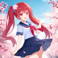 1girl, solo, skirt, long hair, school uniform, pleated skirt, hair ornament, brown hair, sailor collar, serafuku, cherry blossoms, blue skirt, white shirt, shirt, looking at viewer, long sleeves, flower, neckerchief, hairclip, blurry, red neckerchief, closed mouth, braid, cowboy shot, very long hair, red eyes, smile, blue sailor collar, blush, pink flower, blurry background, hand up, hair flower, depth of field, standing, ahoge, branch, midriff peek, petals, breasts, outdoors