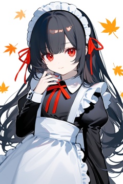 red nails,1girl,red eyes,solo,simple background,black hair,long sleeves,long hair,maid,apron,red ribbon,nail polish,maid headdress,black dress,closed mouth,puffy sleeves,looking at viewer,ribbon,juliet sleeves,dress,hand up,maid apron,leaf,hair ribbon,white background,upper body,white apron,collared dress,smile,