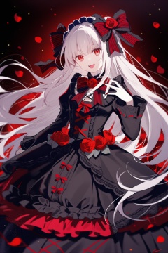 1girl, solo, red_eyes, long_hair, dress, flower, rose, bow, letterboxed, lolita_fashion, striped_bow, vampire, open_mouth, frilled_dress, frills, looking_at_viewer, red_flower, hair_bow, smile, very_long_hair, breasts, gothic_lolita, red_rose, petals, fangs, black_dress, signature