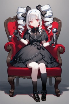 1girl,solo,red eyes,sitting,drill hair,dress,white hair,looking at viewer,bow,frills,black footwear,chair,black bow,black dress,shoes,socks,full body,asymmetrical legwear,gloves,twin drills,holding,