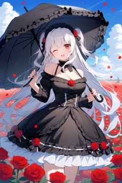 1girl, red flower, solo, umbrella, flower, holding umbrella, dress, breasts, black dress, black umbrella, one eye closed, long hair, cleavage, outdoors, holding, white hair, sky, petals, black headwear, red eyes, bare shoulders, two side up, hat, day, long sleeves, looking at viewer, cloud, blue sky, gothic lolita, open mouth, frills, lolita fashion, off shoulder, large breasts, frilled umbrella, very long hair, field, blush, flower field, frilled dress, off-shoulder dress, red rose