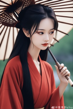 masterpiece,best quality,high quality,1girl,umbrella,solo,black hair,realistic,holding umbrella,holding,asian,weibo username,weibo logo,oil-paper umbrella,long hair,red lips,blurry,upper body,black eyes,japanese clothes,closed mouth,hanfu,looking down,long sleeves,looking to the side,kimono,blurry background,lips,red dress,outdoors,loose hair strand,sky,standing,depth of field,hand up,wide sleeves,