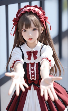 masterpiece,best quality,high quality,realistic,1girl,blurry,solo,card,dress,parted lips,red lips,long hair,looking at viewer,blurry background,lolita fashion,ace \(playing card\),hairband,playing card,two-tone dress,brown hair,depth of field,puffy sleeves,heart,lolita hairband,short sleeves,ace of hearts,red bow,gothic lolita,puffy short sleeves,bow,red ribbon,bowtie,ribbon,reaching towards viewer,red bowtie,outstretched hand,