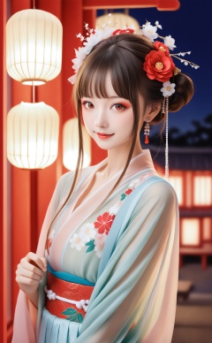 masterpiece,best quality,high quality,1girl,flower,hair ornament,solo,hanfu,hair flower,brown hair,earrings,smile,jewelry,upper body,paper lantern,looking at viewer,lantern,floral print,blurry,realistic,blurry background,closed mouth,brown eyes,blunt bangs,red eyes,sash,red flower,camellia,kanzashi,lips,red lips,makeup,depth of field,see-through,obi,east asian architecture,night,sidelocks,hair bun,nose,architecture,