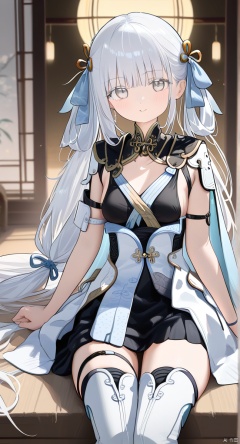 1girl, solo, long hair, small breasts, looking at viewer, bangs, hair ornament, ribbon, jewelry, sitting, very long hair, hair ribbon, white hair, boots, cape, high heels, grey eyes, thigh boots, white footwear, tassel, high heel boots,dress,chinese clothes,,black dress,short sleeves,white coat, collar,