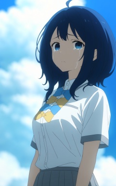 8k, best quality, masterpiece, (ultra-detailed), (high detailed skin), <lora:Yanami_Anna-a3-Tanger:0.8>, Yanami Anna, 1girl, blue hair, blue eyes, default clothes, white shirt, short sleeves, school uniform, bow, beautiful blue sky, cloud, standing, ( upper body:1.2), looking at viewer, tears, two eyes without god, both eyes out of focus, empty eyes,