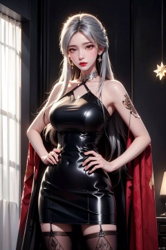 masterpiece, ultra-clear picture quality, real effect, 8k ultra-clear, fine picture effect,((poakl)),white hair,cableknit,fishnets,floral print,leopard print,star \(symbol\),argyle,argyle legwear,print legwear, blackpantyhose,1girl, solo, long hair, breasts, looking at viewer, black hair, dress, jewelry, closed mouth, cowboy shot, earrings, choker, indoors, white dress, lips, hand on hip, bed, tattoo, curtains, red lips