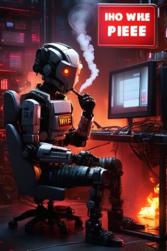 A lone  robot sits in his chair, smoking a cigarette while the computer room he is in is filled with flames, smoke is coming out of the central server with a big sign above it that reads "OH FUDGE I NEED HELP" in big red bold letters. The robot is speaking on the telephone, holding a sign "FIRE!! FIRE!! HELP US!!" in yellow text, highly detailed, ultra high quality, 4k