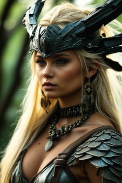 close up on face, masterpiece, great lighting, closeup portrait of stunning tribal elf, Japanese, long blonde hair, bangs, tanned skin, dragon-skull bone helmet, earrings, hair ornaments, leather armor, no shirt, cleavage, armlets, ornate necklace, forest in dappled sunlight. Perfect Composition, realistic photographic image, RAW photo highest qualit