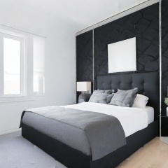 a bedroom with a black headboard, white walls and grey bedding on the floor next to a window,Interior design
