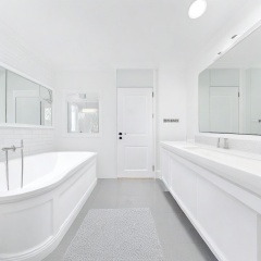 a clean white bathroom with gray counter tops and a large walk - in tub next to the bathtub,Interior design