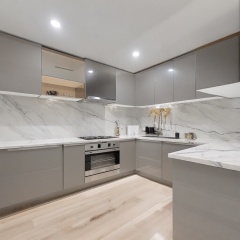 a modern kitchen with a marble counter top and stainless steel appliances in the middle of a hardwood floor,Interior design