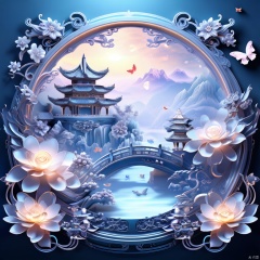 中国3D山水画背景,(复杂雕刻背景),中国宋代山水画,蓝色主题,超现实主义幻想风格,闪电,光,发光蝴蝶,宝石,闪闪发光,丝带,花,花瓣,反射,反射光,宝石,凤凰