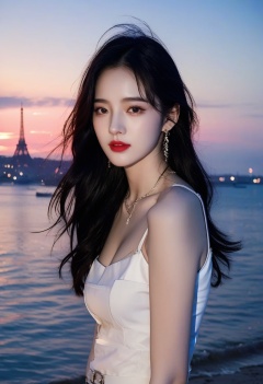 hyper realistic photo of a beautiful girl,20yo,detailed exquisite face,soft shiny skin,Korean K-pop girl,long and natural black hair styled impeccably reflecting modern urban trends,perfect female form,model body,elegant urban fashion,earrings and necklaces,Kristen Stewart lookalike, Standing at beautiful Nice beach in Paris,sea shore,bird,ocean, Red and blue colors, dark:1.3,chiaroscuro lighting:1.2, ek_ph0t0_b00ster